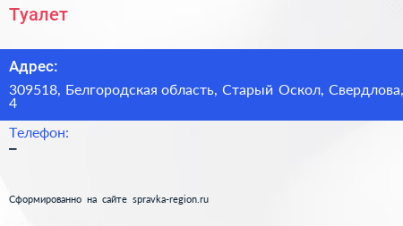 Туалет по адресу 309518, Белгородская область, Старый Оскол, Свердлова, 4 в дальнейшем Организация, размещена в следующих категориях: