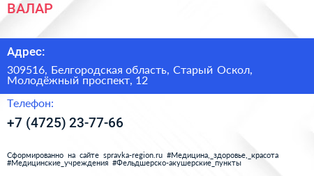 ВАЛАР по адресу 309516, Белгородская область, Старый Оскол, Молодёжный проспект, 12 в дальнейшем Организация, размещена в следующих категориях: