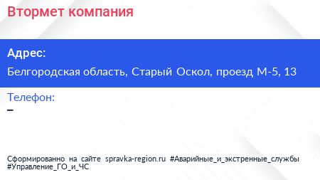 Втормет, компания по адресу Белгородская область, Старый Оскол, проезд М-5, 13 в дальнейшем Организация, размещена в следующих категориях:
