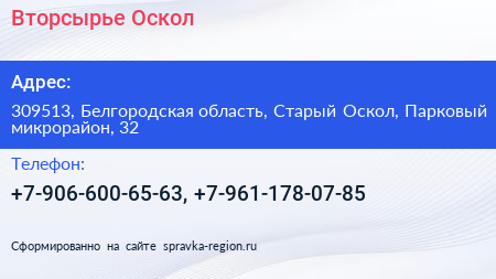 Вторсырье Оскол по адресу 309513, Белгородская область, Старый Оскол, Парковый микрорайон, 32 в дальнейшем Организация, размещена в следующих категориях: