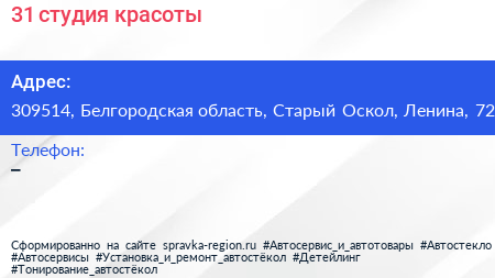 31, студия красоты по адресу 309514, Белгородская область, Старый Оскол, Ленина, 72 в дальнейшем Организация, размещена в следующих категориях:
