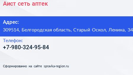 Аист, сеть аптек по адресу 309514, Белгородская область, Старый Оскол, Ленина, 34 в дальнейшем Организация, размещена в следующих категориях: