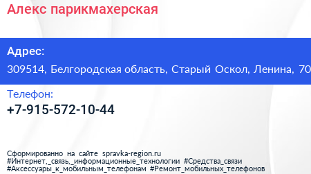 Алекс, парикмахерская по адресу 309514, Белгородская область, Старый Оскол, Ленина, 70 в дальнейшем Организация, размещена в следующих категориях: