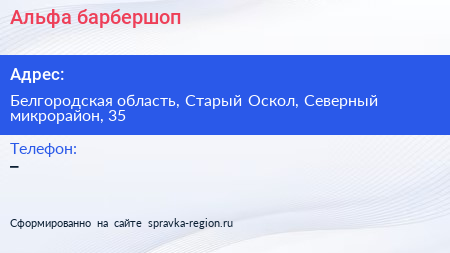 Альфа, барбершоп по адресу Белгородская область, Старый Оскол, Северный микрорайон, 35 в дальнейшем Организация, размещена в следующих категориях: