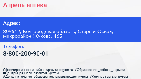 Апрель, аптека по адресу 309512, Белгородская область, Старый Оскол, микрорайон Жукова, 46Б в дальнейшем Организация, размещена в следующих категориях: