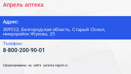 Апрель, аптека по адресу 309512, Белгородская область, Старый Оскол, микрорайон Жукова, 25 в дальнейшем Организация, размещена в следующих категориях: