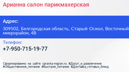 Арианна, салон-парикмахерская по адресу 309502, Белгородская область, Старый Оскол, Восточный микрорайон, 48 в дальнейшем Организация, размещена в следующих категориях: