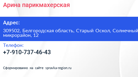 Арина, парикмахерская по адресу 309502, Белгородская область, Старый Оскол, Солнечный микрорайон, 12 в дальнейшем Организация, размещена в следующих категориях: