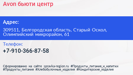 Avon, бьюти-центр по адресу 309511, Белгородская область, Старый Оскол, Олимпийский микрорайон, 61 в дальнейшем Организация, размещена в следующих категориях: