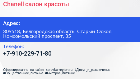 Chanell, салон красоты по адресу 309518, Белгородская область, Старый Оскол, Комсомольский проспект, 35 в дальнейшем Организация, размещена в следующих категориях: