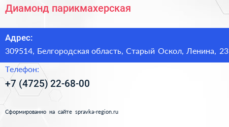 Диамонд, парикмахерская по адресу 309514, Белгородская область, Старый Оскол, Ленина, 23 в дальнейшем Организация, размещена в следующих категориях: