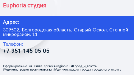 Euphoria, студия по адресу 309502, Белгородская область, Старый Оскол, Степной микрорайон, 11 в дальнейшем Организация, размещена в следующих категориях: