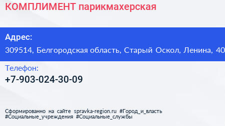 КОМПЛИМЕНТ, парикмахерская по адресу 309514, Белгородская область, Старый Оскол, Ленина, 40 в дальнейшем Организация, размещена в следующих категориях: