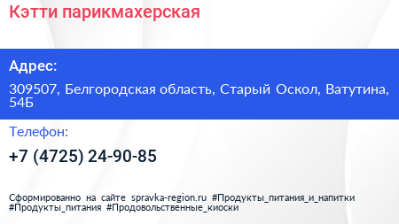 Кэтти, парикмахерская по адресу 309507, Белгородская область, Старый Оскол, Ватутина, 54Б в дальнейшем Организация, размещена в следующих категориях: