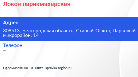 Локон, парикмахерская по адресу 309513, Белгородская область, Старый Оскол, Парковый микрорайон, 14 в дальнейшем Организация, размещена в следующих категориях: