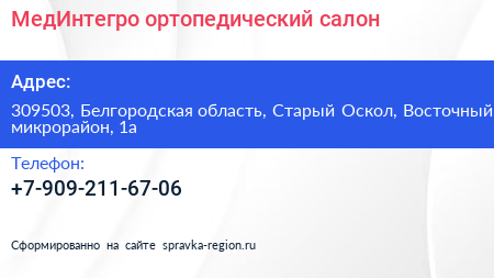 МедИнтегро, ортопедический салон по адресу 309503, Белгородская область, Старый Оскол, Восточный микрорайон, 1а в дальнейшем Организация, размещена в следующих категориях: