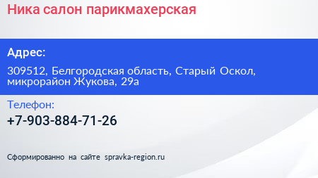 Ника, салон-парикмахерская по адресу 309512, Белгородская область, Старый Оскол, микрорайон Жукова, 29а в дальнейшем Организация, размещена в следующих категориях:
