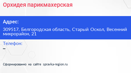 Орхидея, парикмахерская по адресу 309517, Белгородская область, Старый Оскол, Весенний микрорайон, 21 в дальнейшем Организация, размещена в следующих категориях:
