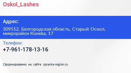 Oskol_Lashes по адресу 309512, Белгородская область, Старый Оскол, микрорайон Конева, 17 в дальнейшем Организация, размещена в следующих категориях: