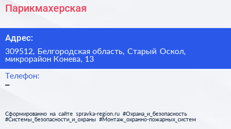 Парикмахерская по адресу 309512, Белгородская область, Старый Оскол, микрорайон Конева, 13 в дальнейшем Организация, размещена в следующих категориях: