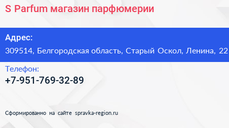 S Parfum, магазин парфюмерии по адресу 309514, Белгородская область, Старый Оскол, Ленина, 22 в дальнейшем Организация, размещена в следующих категориях: