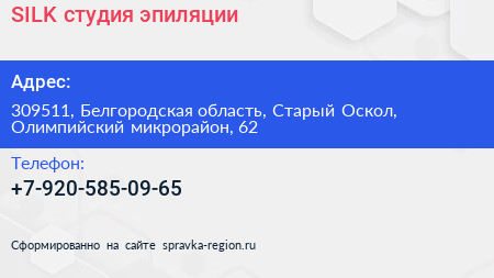SILK, студия эпиляции по адресу 309511, Белгородская область, Старый Оскол, Олимпийский микрорайон, 62 в дальнейшем Организация, размещена в следующих категориях: