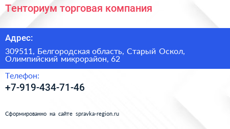 Тенториум, торговая компания по адресу 309511, Белгородская область, Старый Оскол, Олимпийский микрорайон, 62 в дальнейшем Организация, размещена в следующих категориях:
