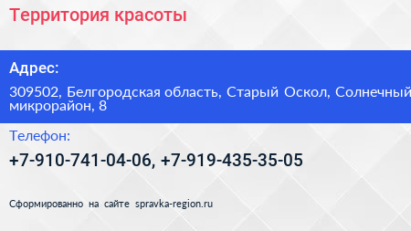 Территория красоты по адресу 309502, Белгородская область, Старый Оскол, Солнечный микрорайон, 8 в дальнейшем Организация, размещена в следующих категориях: