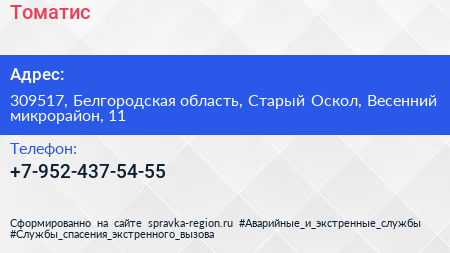 Томатис по адресу 309517, Белгородская область, Старый Оскол, Весенний микрорайон, 11 в дальнейшем Организация, размещена в следующих категориях: