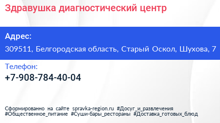 Здравушка, диагностический центр по адресу 309511, Белгородская область, Старый Оскол, Шухова, 7 в дальнейшем Организация, размещена в следующих категориях: