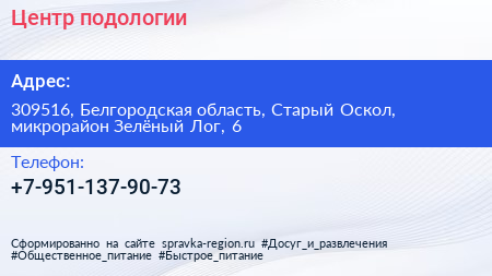 Центр подологии по адресу 309516, Белгородская область, Старый Оскол, микрорайон Зелёный Лог, 6 в дальнейшем Организация, размещена в следующих категориях:
