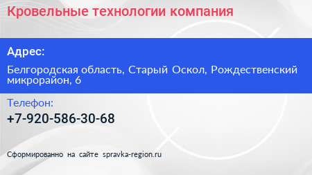 Кровельные технологии, компания по адресу Белгородская область, Старый Оскол, Рождественский микрорайон, 6 в дальнейшем Организация, размещена в следующих категориях: