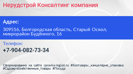 Нерудстрой-Консалтинг, компания по адресу 309516, Белгородская область, Старый Оскол, микрорайон Будённого, 16 в дальнейшем Организация, размещена в следующих категориях: