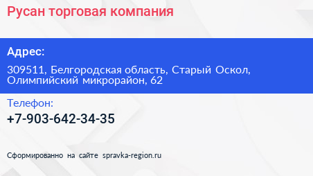 Русан, торговая компания по адресу 309511, Белгородская область, Старый Оскол, Олимпийский микрорайон, 62 в дальнейшем Организация, размещена в следующих категориях: