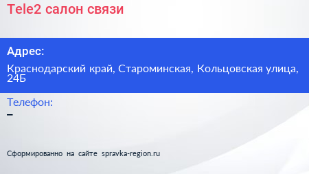 Tele2, салон связи по адресу Краснодарский край, Староминская, Кольцовская улица, 24Б в дальнейшем Организация, размещена в следующих категориях: