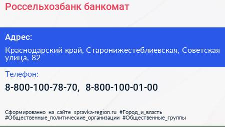 Россельхозбанк, банкомат по адресу Краснодарский край, Старонижестеблиевская, Советская улица, 82 в дальнейшем Организация, размещена в следующих категориях: