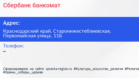Сбербанк, банкомат по адресу Краснодарский край, Старонижестеблиевская, Первомайская улица, 11Б в дальнейшем Организация, размещена в следующих категориях: