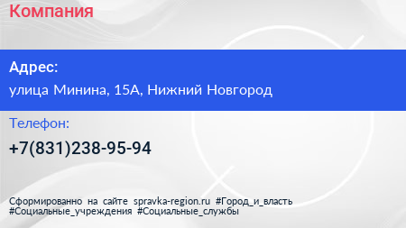 Для связи с организацией воспользуйтесь номером телефона: +7(831)238-95-94. Пн-Пт: с 8:00 до 19:00; Сб: с 9:00 до 19:00; Вс: с 9:00 до 17:00, вы можете обратиться в эту организацию.