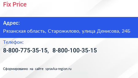 Fix Price по адресу Рязанская область, Старожилово, улица Денисова, 24Б в дальнейшем Организация, размещена в следующих категориях: