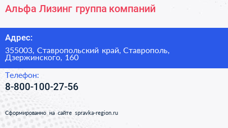 Альфа-Лизинг, группа компаний по адресу 355003, Ставропольский край, Ставрополь, Дзержинского, 160 в дальнейшем Организация, размещена в следующих категориях: