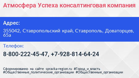 Атмосфера Успеха, консалтинговая компания по адресу 355042, Ставропольский край, Ставрополь, Доваторцев, 65а в дальнейшем Организация, размещена в следующих категориях: