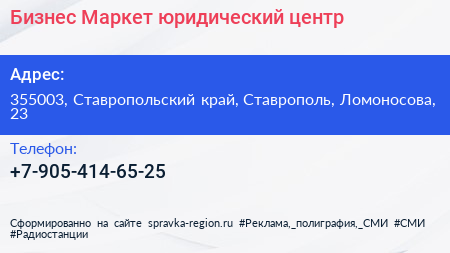 Бизнес-Маркет, юридический центр по адресу 355003, Ставропольский край, Ставрополь, Ломоносова, 23 в дальнейшем Организация, размещена в следующих категориях: