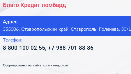 Благо Кредит, ломбард по адресу 355006, Ставропольский край, Ставрополь, Голенева, 30/1 в дальнейшем Организация, размещена в следующих категориях:
