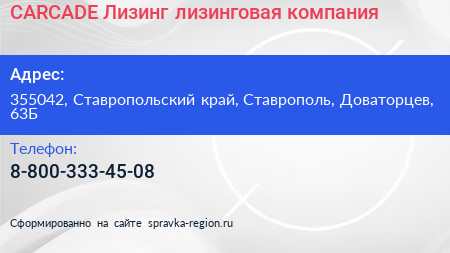 CARCADE Лизинг, лизинговая компания по адресу 355042, Ставропольский край, Ставрополь, Доваторцев, 63Б в дальнейшем Организация, размещена в следующих категориях:
