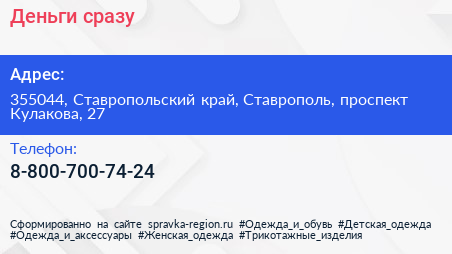 Деньги сразу по адресу 355044, Ставропольский край, Ставрополь, проспект Кулакова, 27 в дальнейшем Организация, размещена в следующих категориях: