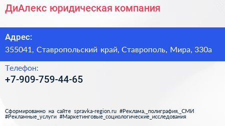 ДиАлекс, юридическая компания по адресу 355041, Ставропольский край, Ставрополь, Мира, 330а в дальнейшем Организация, размещена в следующих категориях: