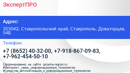ЭкспертПРО по адресу 355042, Ставропольский край, Ставрополь, Доваторцев, 54Б в дальнейшем Организация, размещена в следующих категориях: