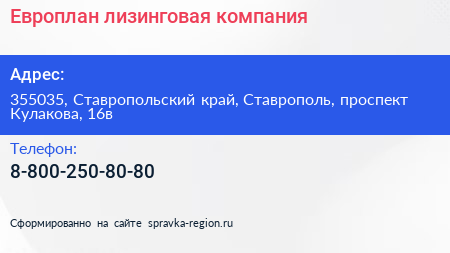 Европлан, лизинговая компания по адресу 355035, Ставропольский край, Ставрополь, проспект Кулакова, 16в в дальнейшем Организация, размещена в следующих категориях:
