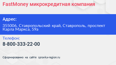 FastMoney, микрокредитная компания по адресу 355006, Ставропольский край, Ставрополь, проспект Карла Маркса, 59а в дальнейшем Организация, размещена в следующих категориях: