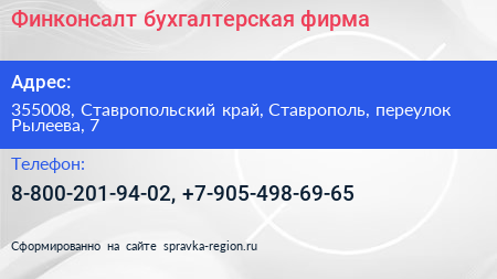 Финконсалт, бухгалтерская фирма по адресу 355008, Ставропольский край, Ставрополь, переулок Рылеева, 7 в дальнейшем Организация, размещена в следующих категориях: